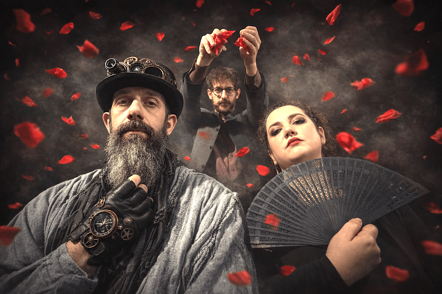 Επί σκηνής, τρεις ηθοποιοί και τέσσερις μουσικοί συγκροτούν ένα ενιαίο εκτελεστικό